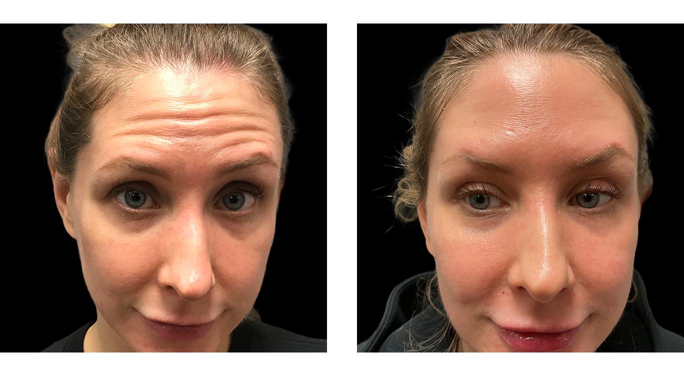 This patient receives neuromodulator treatments to soften the horizontal expression lines on her forehead, which are caused by the repeated contraction of the frontalis muscle. The product is strategically placed to temporarily relax this muscle, preventing the strong upward pull that creases the overlying skin. The result is a smoother, more refreshed appearance that also helps prevent these dynamic lines from becoming permanently etched into the skin over time.