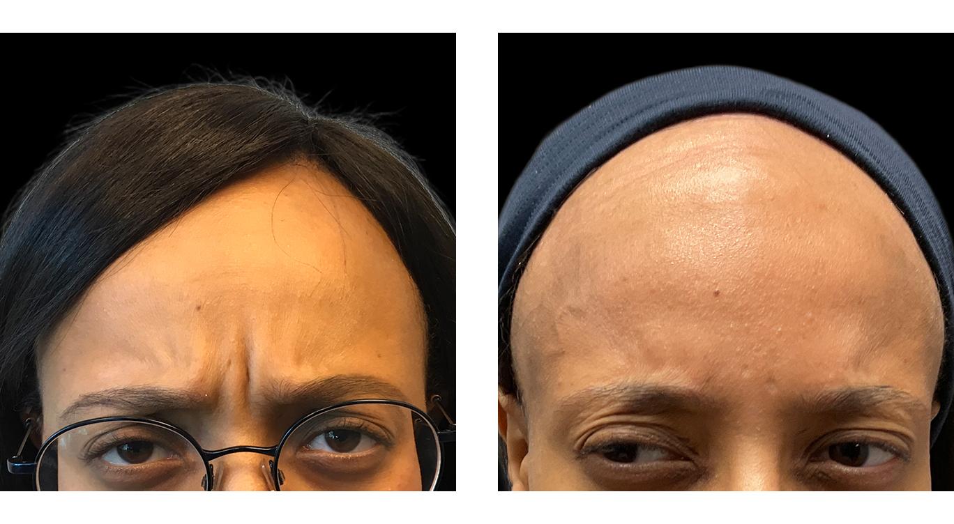 To prevent the formation of deep “11” lines, this patient proactively receives neuromodulator treatments in her glabella, the muscle complex between the eyebrows. The neuromodulator works by relaxing the specific muscles that pull the brows together, preventing the repetitive contractions that etch lines into the skin. This not only smooths the area for a more serene and rested appearance but also serves as a crucial preventative measure to stop deep, static wrinkles from ever forming.