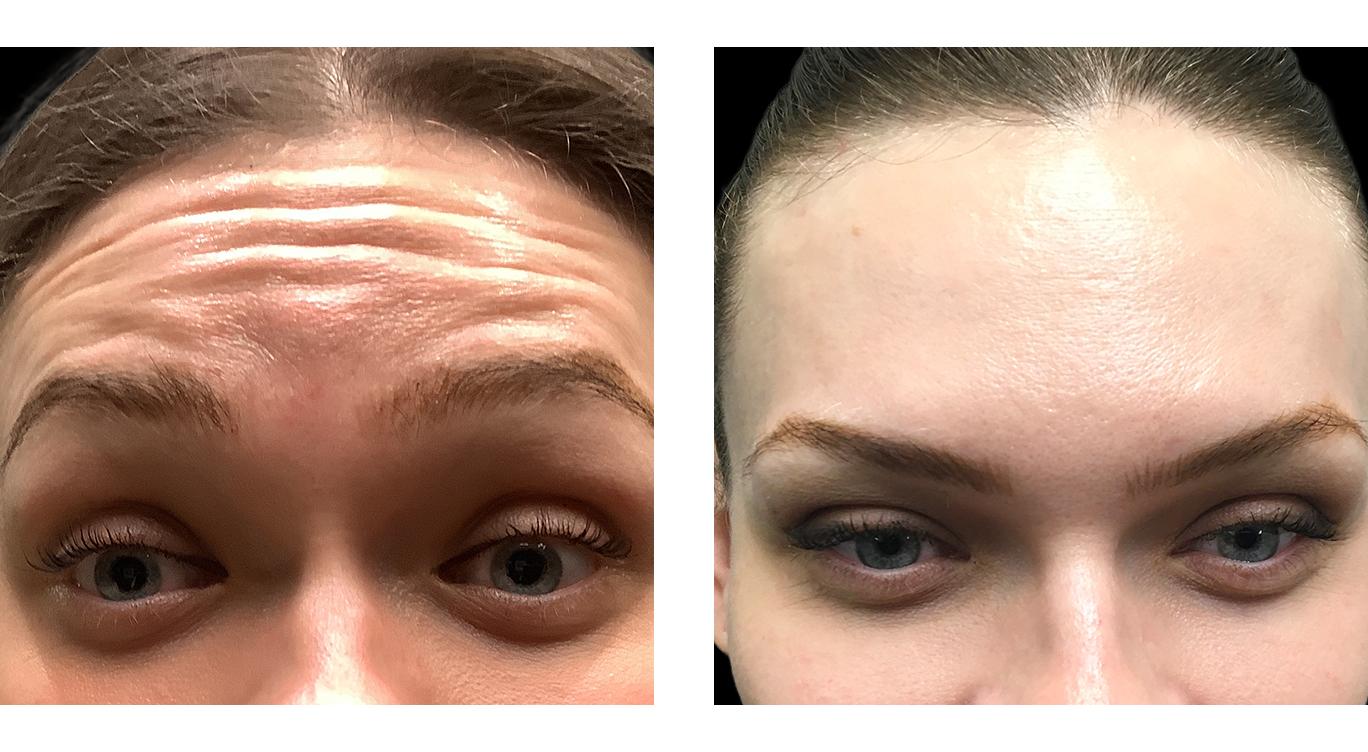 To address the horizontal wrinkles that form when raising her eyebrows, this patient receives neuromodulator treatments to her forehead. The product is strategically placed to temporarily relax the underlying frontalis muscle, preventing the strong contractions that crease the overlying skin. This results in a smoother, more refreshed appearance and helps prevent these expression lines from becoming permanently etched into the skin over time.
