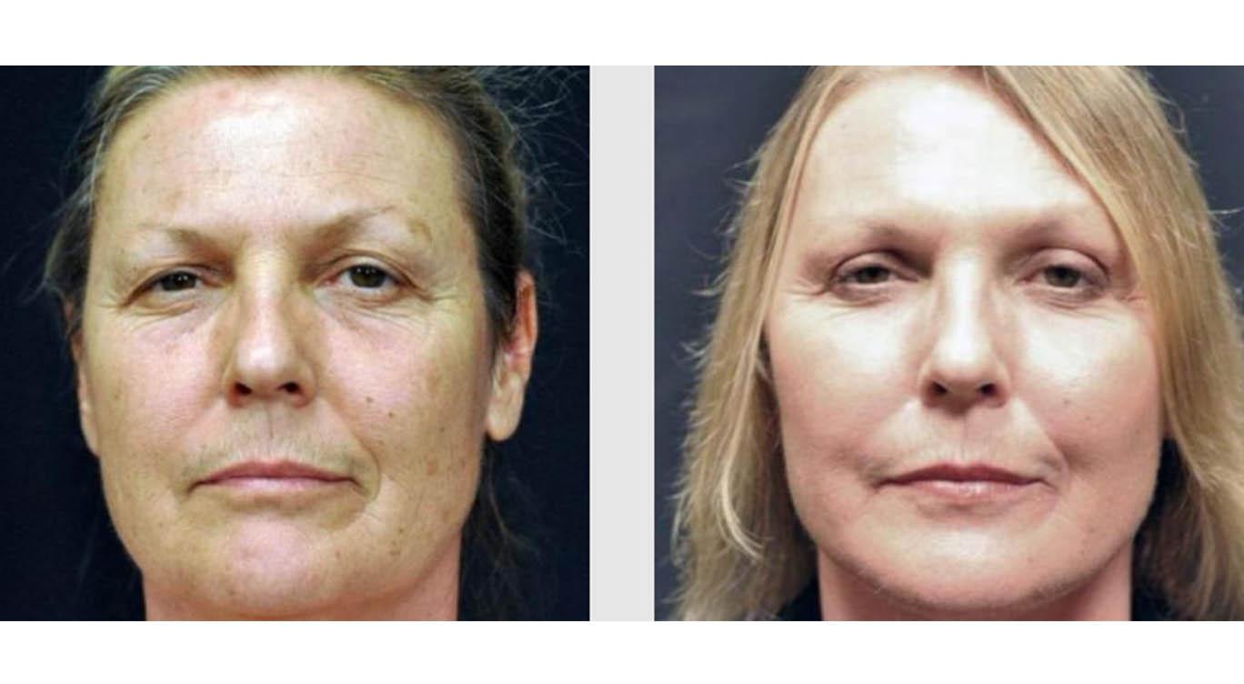 This 54-year-old woman had a complete facial makeover under the hands of Seattle cosmetic surgeon, Dr. Craig Jonov. Using both surgical and nonsurgical skin rejuvenation procedures, he used the latest techniques to create a smoother, younger facial appearance. Our patient desired to have her skin look softer, the wrinkles around her forehead and eyes decreased, and to have a sleeker, more contoured neck. This was all achieved using a combination of procedures including a facelift and eyelid surgery to awaken the upper face, and a neck lift and injectable fillers to improve the lower face. Laser skin resurfacing was used to “finish” off the look. The result is a facial appearance that now glows, with fewer blemishes and age spots, less wrinkles, and an overall brighter, clearer complexion. Our patient looks and feels years younger and is thrilled with her results.