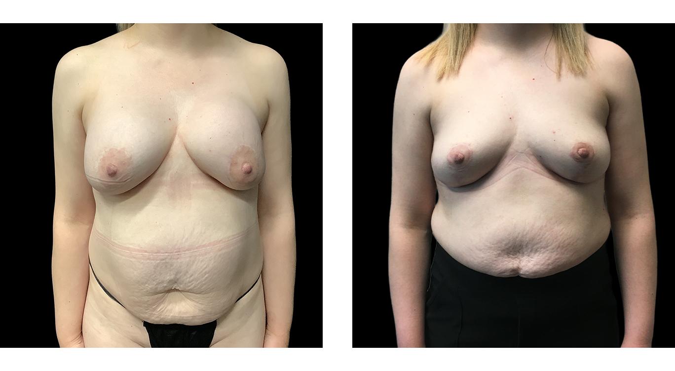 This patient’s one-year results showcase a successful implant removal (explant) combined with a mastopexy and auto augmentation. The procedure involves removing the implant and repurposing the patient’s native breast tissue to reconstruct a natural-looking breast mound. This technique effectively addresses post-explant skin laxity and creates a stable, aesthetically pleasing breast shape without the need for a new implant.