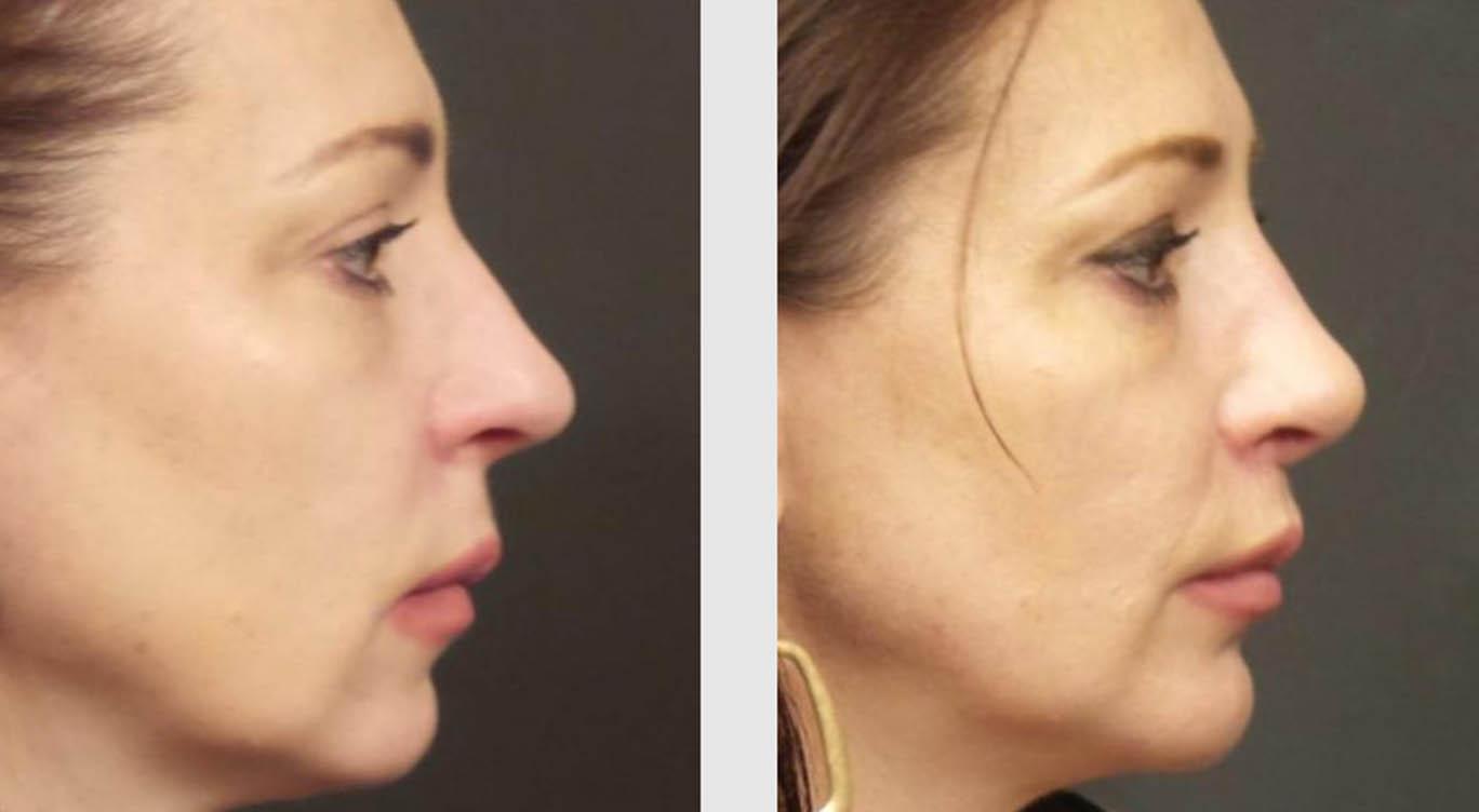 Patient presents with concerns over the appearance of her nose and chin. Patient underwent rhinoplasty and chin augmentation to restore facial symmetry and balance.